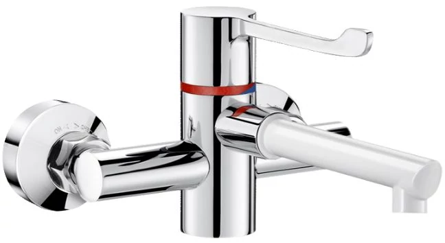 DELABIE SECURITHERM fali termosztatikus mosdócsap szekvenciális karral H-M vízre, műanyag BIOCLIP kifolyóval