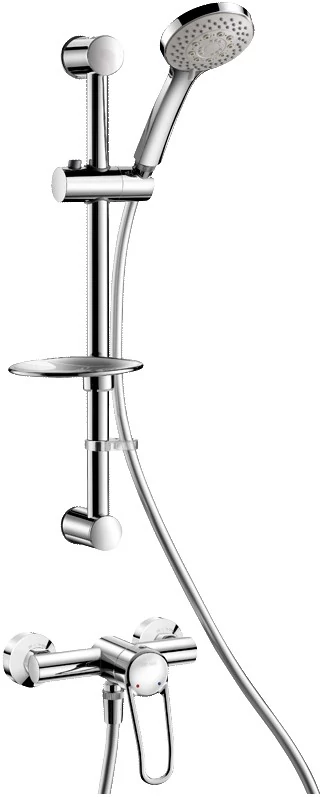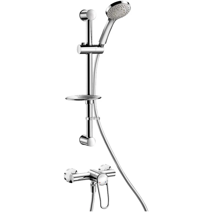 DELABIE SECURITHERM Dual Control falon kívüli termosztatikus zuhanyszett forrázásgátlós hőfok-állítóval és átfolyás-szabályzóval, 9L/p, kézizuhany, szappantartós zuhanyrúd, STOP/CHECK csatlakozók