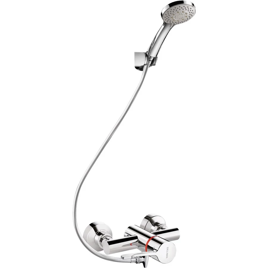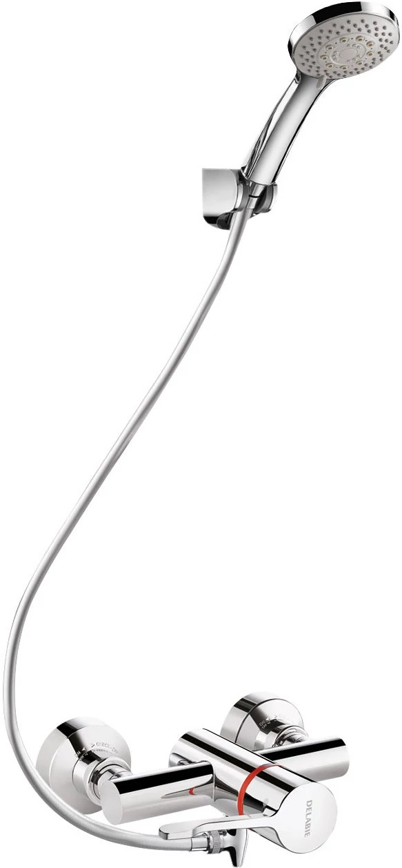 DELABIE SECURITHERM fali zuhanyszett EP nyomáskiegyenlítő forrázásgátlóval, lyukas kar, kézi zuhany, rúd, szappantartó, gégecső L=1,5m, STOP/CHECK tárcsák