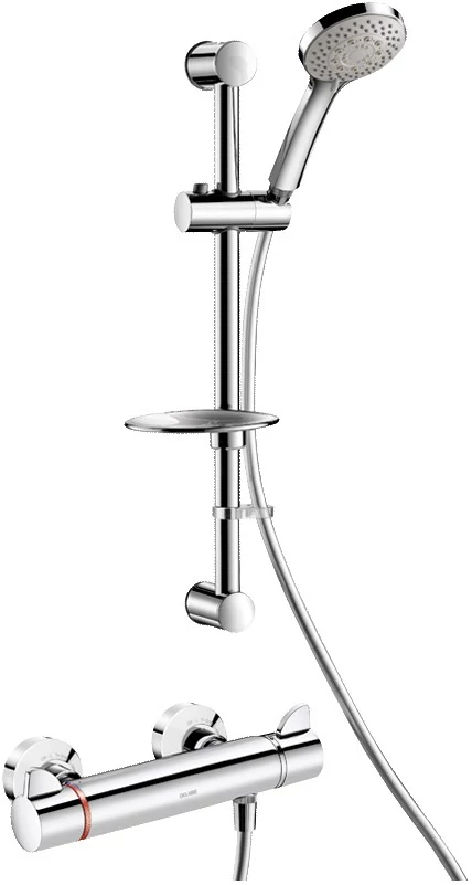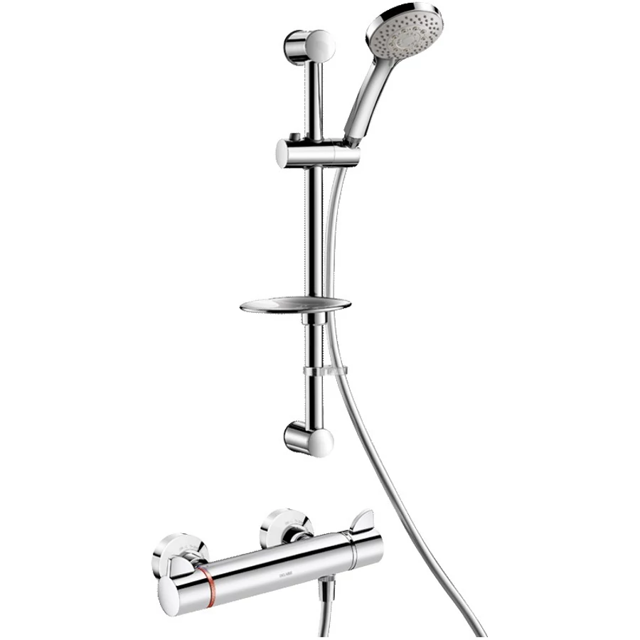 DELABIE SECURITHERM Securitouch termosztatikus zuhanyszett, ERGO tekerőfejek, L=1,5m gégecsöves kézizuhany, rúd, szappantartó, STOP/CHECK