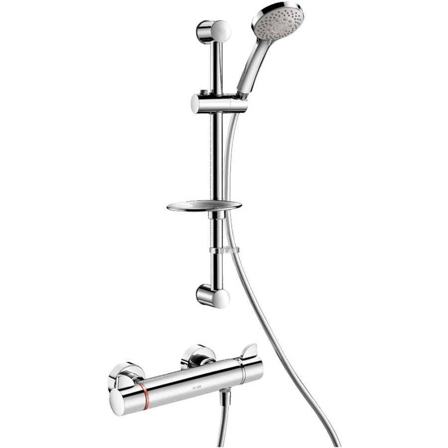 DELABIE SECURITHERM fali zuhanyszett EP nyomáskiegyenlítő forrázásgátlóval, lyukas kar, kézi zuhany, rúd, szappantartó, gégecső L=1,5m, STOP/CHECK tárcsák