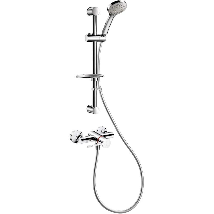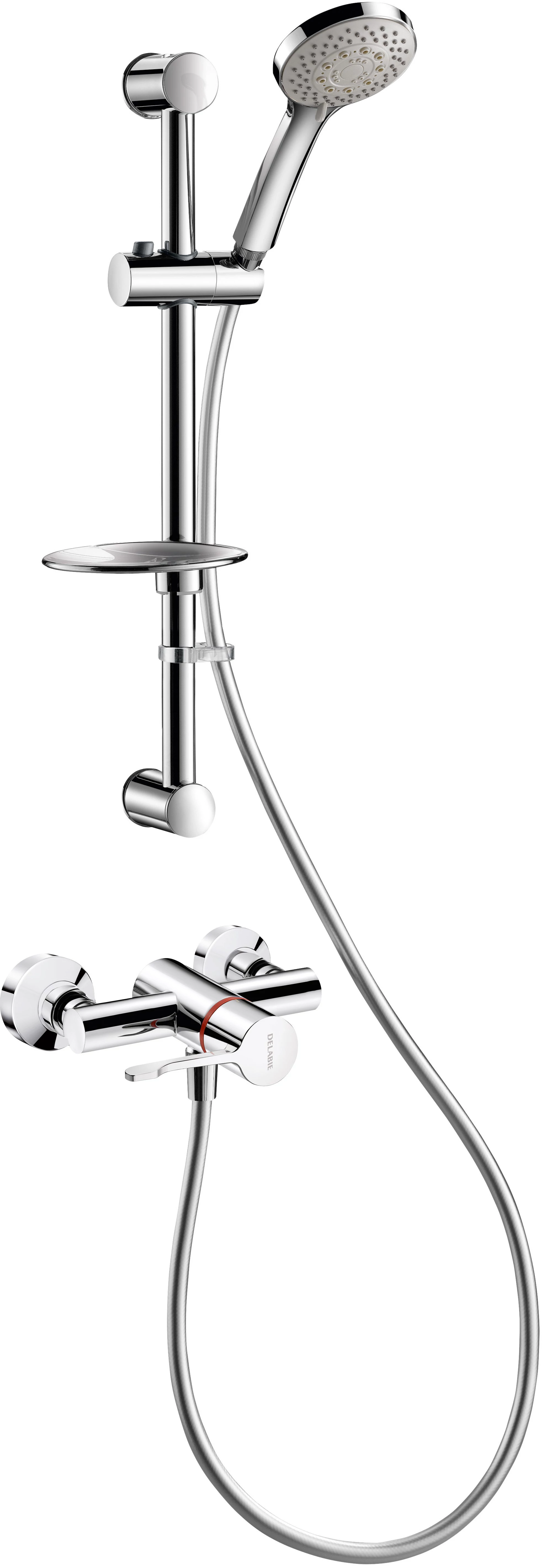 DELABIE SECURITHERM Dual Control falon kívüli termosztatikus zuhanyszett forrázásgátlós hőfok-állítóval és átfolyás-szabályzóval, 9L/p, kézizuhany, szappantartós zuhanyrúd, STOP/CHECK csatlakozók