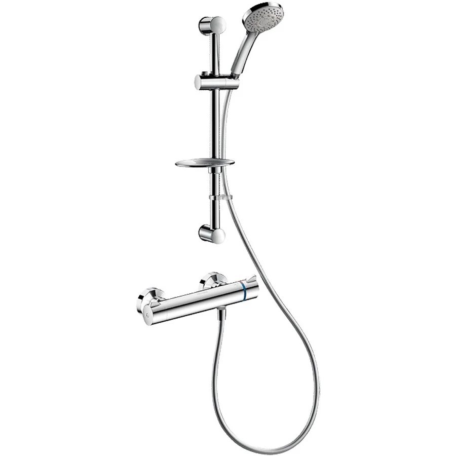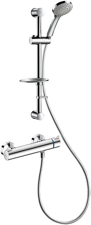 DELABIE SECURITHERM Securitouch termosztatikus zuhanyszett, L=1,5m gégecsöves esőztető kézi zuhany, rúd, szappantartó, STOP/CHECK