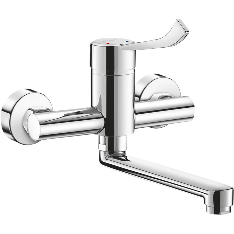 DELABIE fali csaptelep hosszú karral, L=150mm lengő kifolyó, SECURITOUCH hőszigetelt test, H-M vízre, BIOFIL szűrő kompatibilis, 5L/p, sima tárcsák