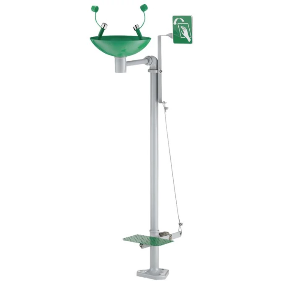 Kézzel működtethető szabadon álló szemmosó egység; 250 mm átmérőjű zöld bevonatú rozsdamentes acél szemmosó tál; 2 fejes szemmosó ABS sokkolásgátlóval, vízátfolyás 20 l/perc (3 bar); galvanizált acél csőrendszer, kézi kapcsoló; sárgaréz tolókar; szemmosó azonosító és tájékoztató jelekkel ellátva