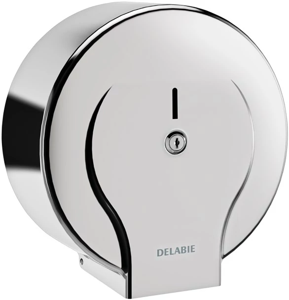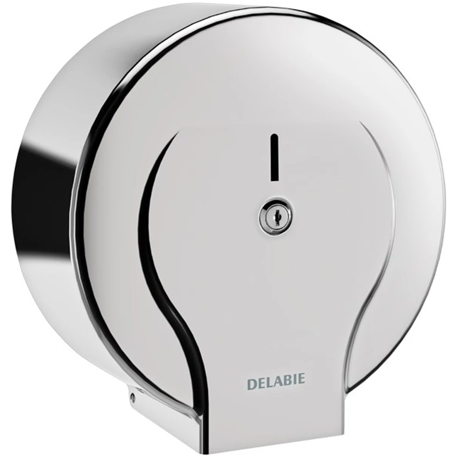 DELABIE ipari extra nagytekercses WC-papír adagoló 400m tekercsekhez, D=310mm, zárható, vandálbiztos r.m. acél ház, fényes
