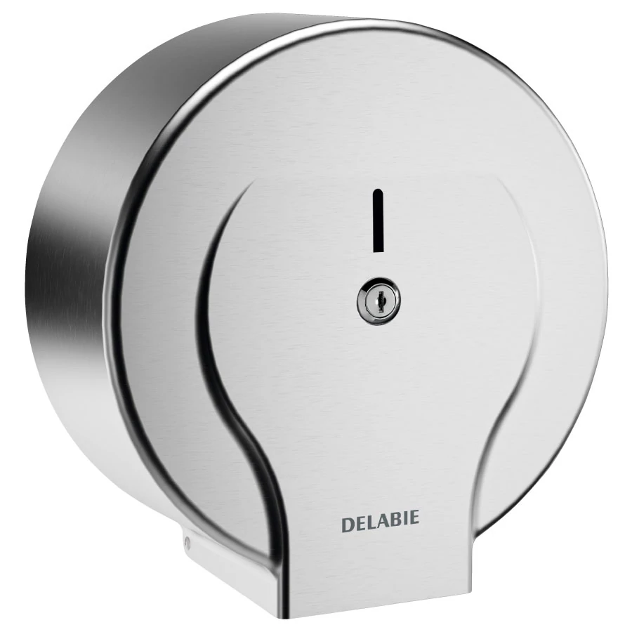 DELABIE ipari extra nagytekercses WC-papír adagoló 400m tekercsekhez, D=310mm, zárható, vandálbiztos r.m. acél ház, fényes