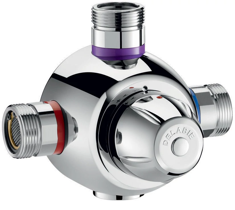 DN25 1" biztonsági cirkulációs termosztatikus keverőszelep DELABIE Premix Security, szűrőkkel és visszacsapó szelepekkel, 44-58°C, 20-70L/p