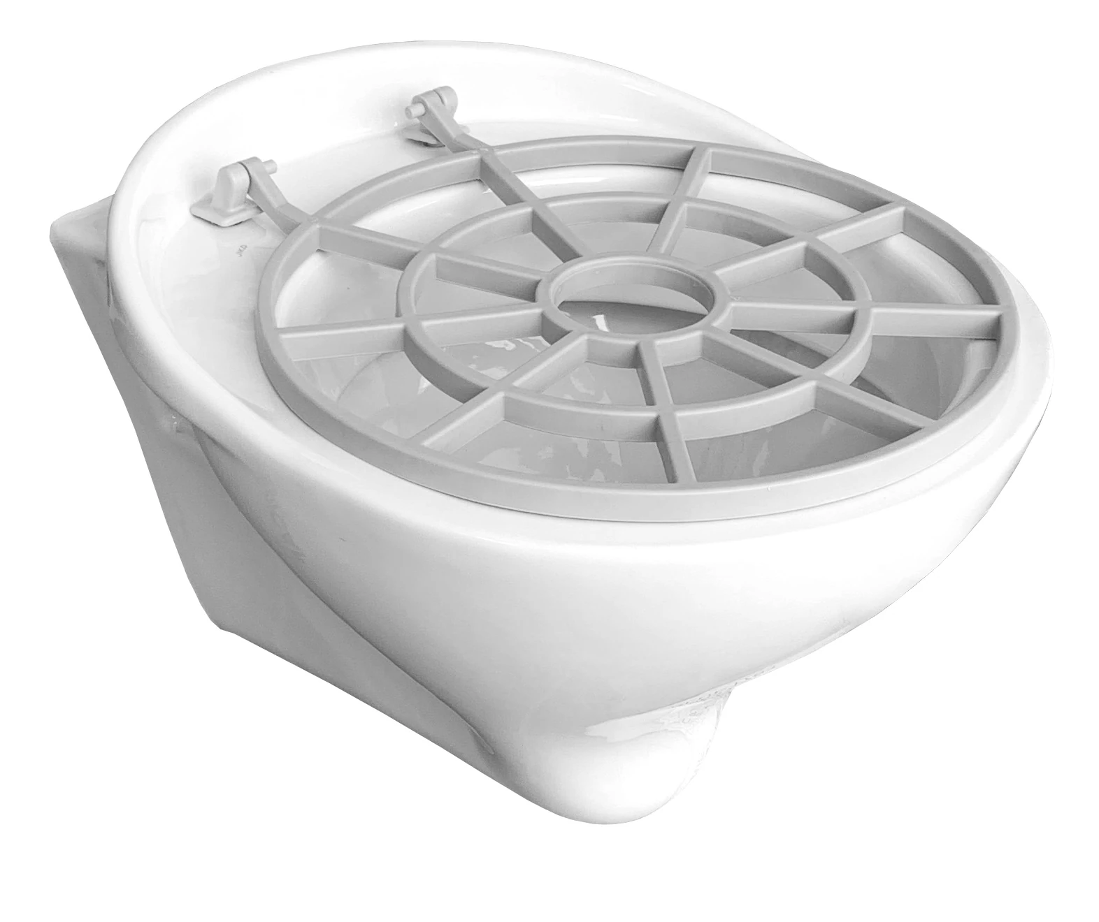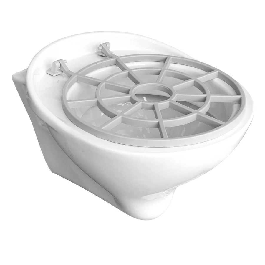 Padlón álló ágytálkiöntő, vatta kiöntő felhajtható műanyag ráccsal, hátsó kifolyás, H=460mm, zománcozott kerámia, fehér