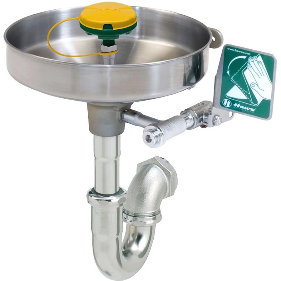 Fali sürgősségi szemmosó és arcmosó egység AXION öblítőfejjel, nyomólapos működtetéssel, rozsdamentes acél tál, öntött alumínium fali rögzítőkonzol, sárga porvédő kupak