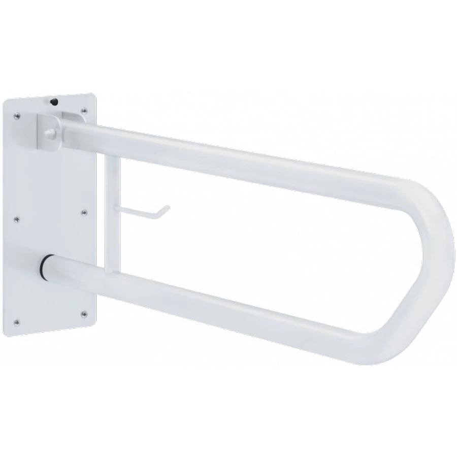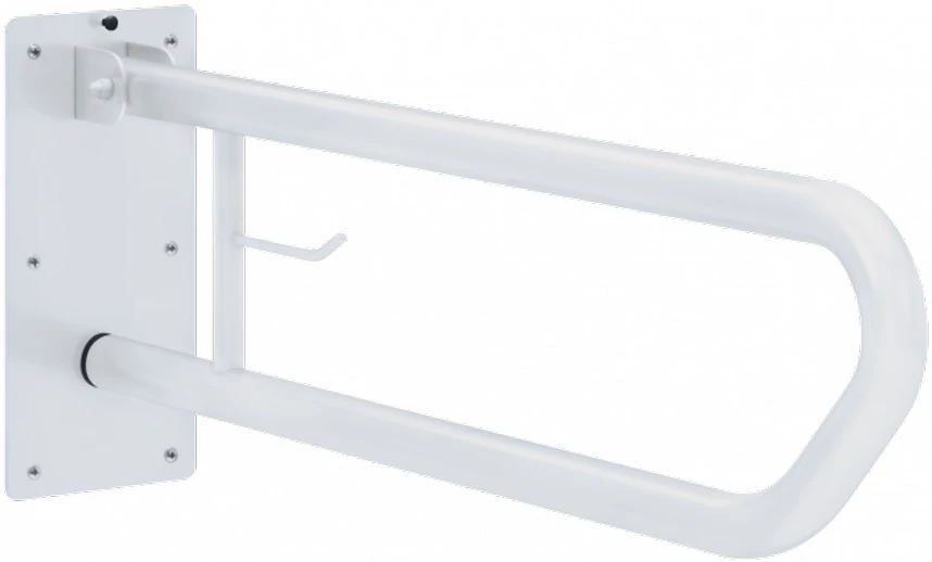 A függőlegesen felhajtható acél kapaszkodó a közösségi mellékhelyiségek falára rögzíthető. Fehér epoxy műgyanta bevonatának köszönhetően csúszásbiztos fogást biztosít.