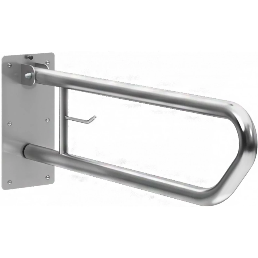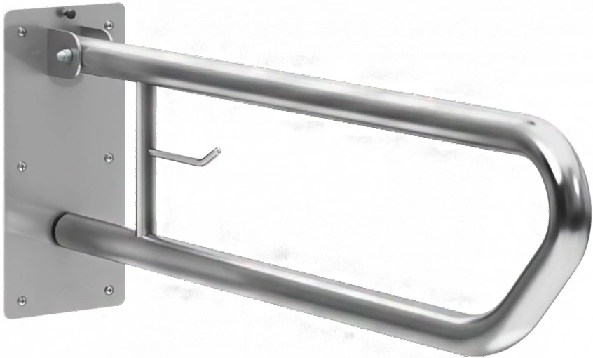 A függőlegesen felhajtható rozsdamentes acél kapaszkodó a közösségi mellékhelyiségek falára rögzíthető. A fényes borítás elegáns megjelenést kölcsönöz a mellékhelyiségeknek.