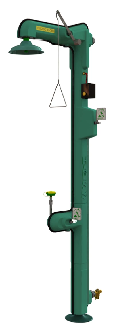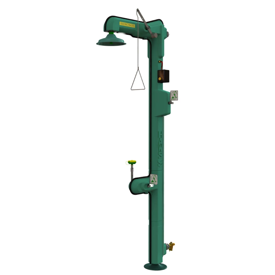A beépített, két régetű, 3/4"-os szigeteléssel ellátott fűtőszálat termosztát verézli, mely bekapcsol, amint a víz hőmérséklete 1,4°C alá süllyed. A sürgősségi vészzuhany, szemmosó egység vészzuhany szelepének nyitását egy húzókar teszi lehetővé, míg a szemmosó működtetéséről a derékmagasságban elhelyezett tolókar gondoskodik. A terméken nagy méretű, könnyen olvasható vészjelzések találhatók. A masszív, rozsdamentes acélból készült csőtartó és horganyzott szerelvények egy erős, korrózióálló berendezést eredményeznek.