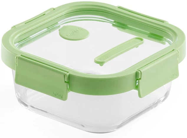 lekerekített, biztonságos kialakítás ergonomikus négyzetes forma halmozható átlátszó üveg tartály szilikon tömítéssel ellátott fedelek - a száraz és nedves tartalmak frissességét hosszabb ideig megőrzi egymásra tehető beépített szelepének köszönhetően az ételek mikróban is kiömlés nélkül melegíthetők üveg fedő |