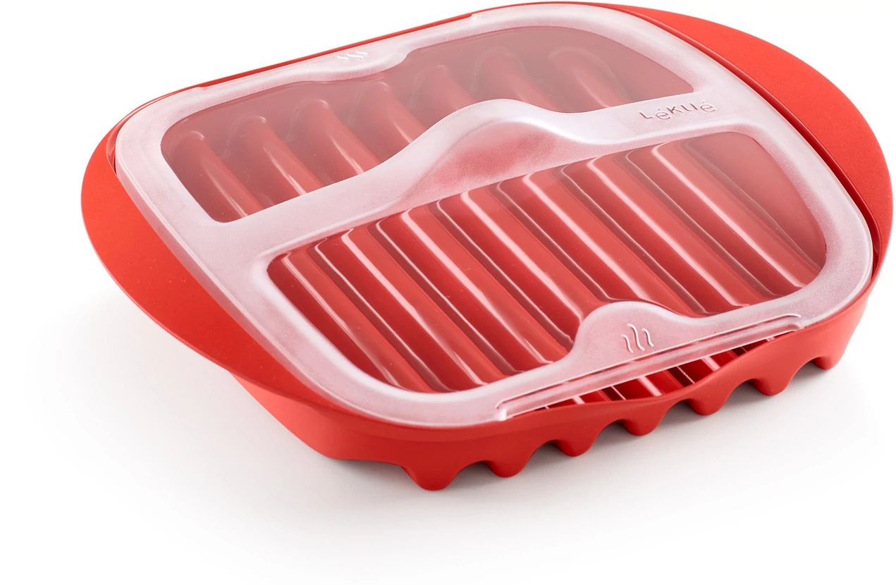 Lékué Microwave Bacon Cooker baconsütő tálca mikrohullámú sütőbe, 6 szelet baconhoz, zsiradékelvezető bordák, műanyag, piros – A tökéletesen ropogós szalonna titka, fröcsögés nélkül