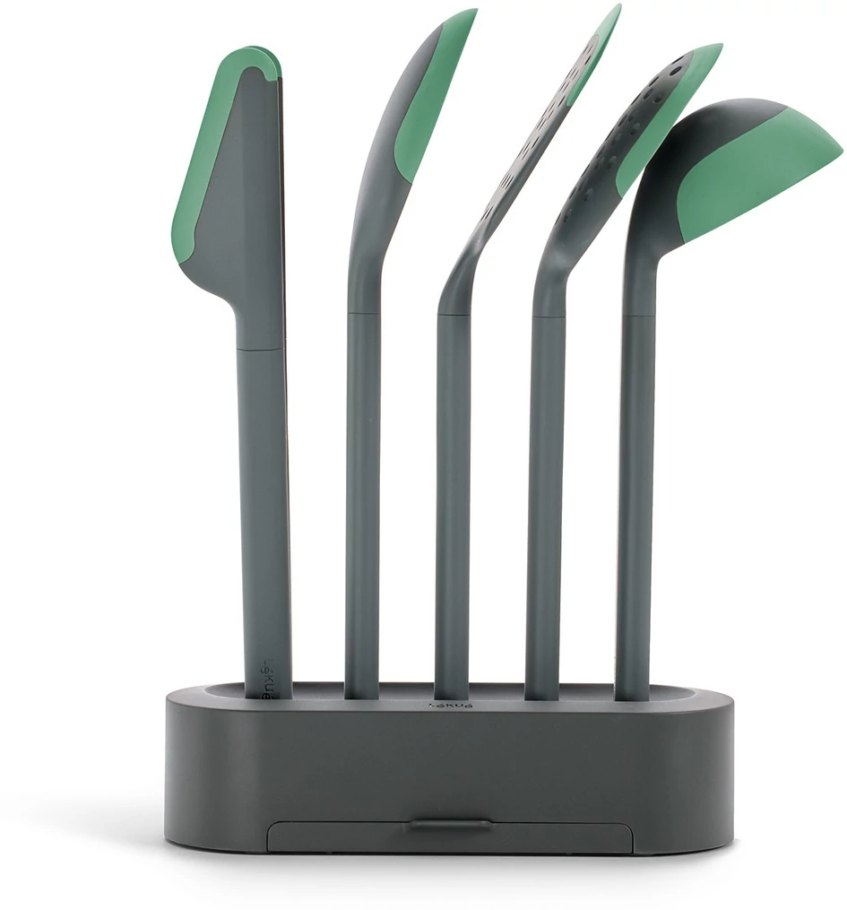 Lékué Non-Scratch Cooking Utensils konyhai eszköz szett, 5db-os, tartóállvánnyal, pihentető tálcával, szilikon élvédőkkel, karcmentes, szürke/zöld – A tapadásmentes edények legjobb barátai