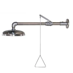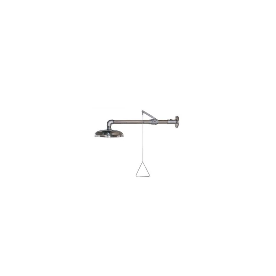 Rozsdamentes acél vészzuhany fali rögzítéssel, rozsdamentes acél szórótárcsával, húzókaros működtetéssel.