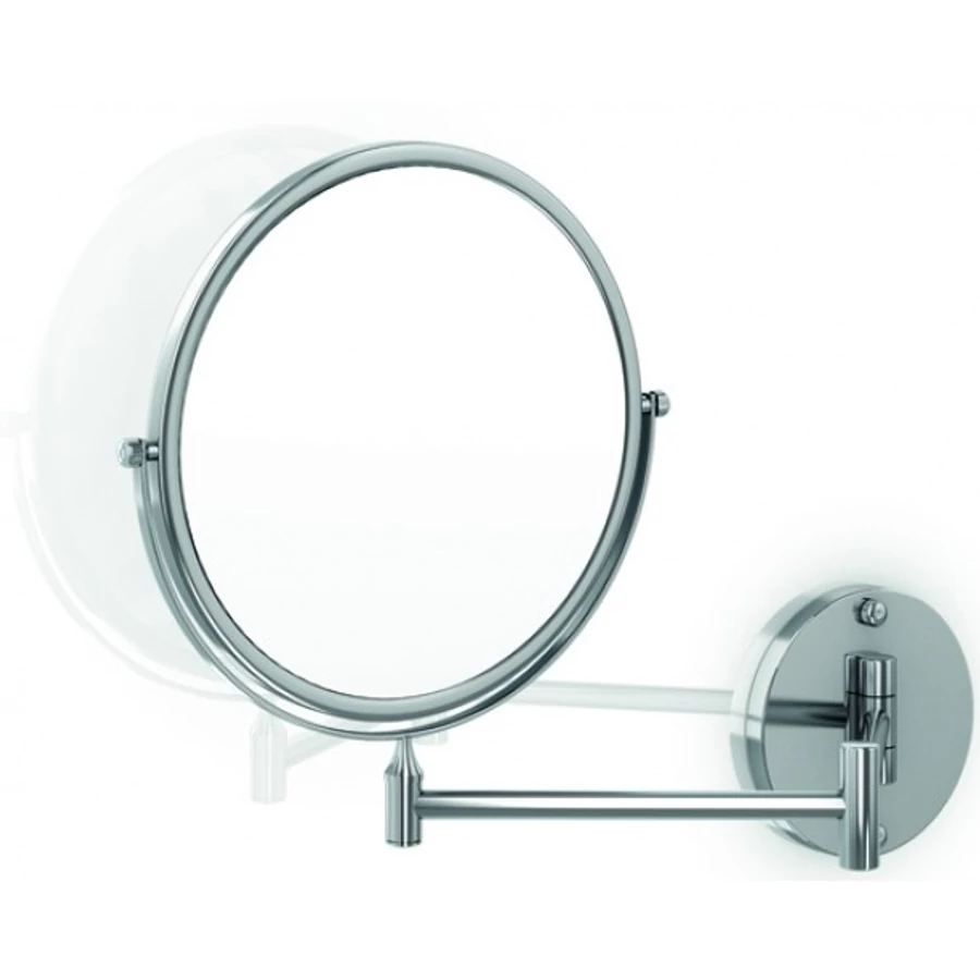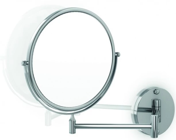 Szállodai kozmetikai pipere tükör 3x-os nagyítással, 150 mm átmérőjű dönthető tükörrel, kihajtható, kerek forma, rozsdamentes acél test, sárgaréz keret krómozott fényes borítással