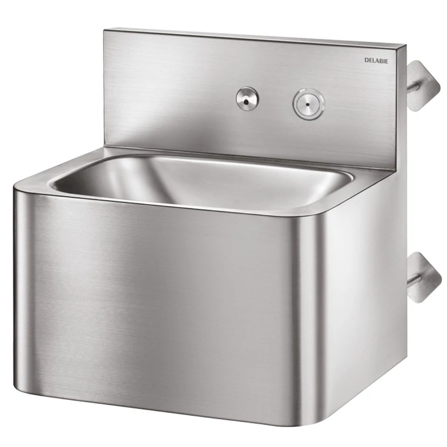 DELABIE TEK vandálbiztos fali kézmosó zárt testtel, időzített nyomógombos, kevert vízre, rongálásbiztos kifolyófej, r.m. acél 1,2mm